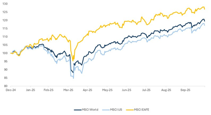 MSCI World Total Net Return Index、MSCI USA Total Net Return Index、MSCI EAFE Total Net Return Index、2024年12月31日を100として指数化。Bloomberg、2025年10月31日時点。
