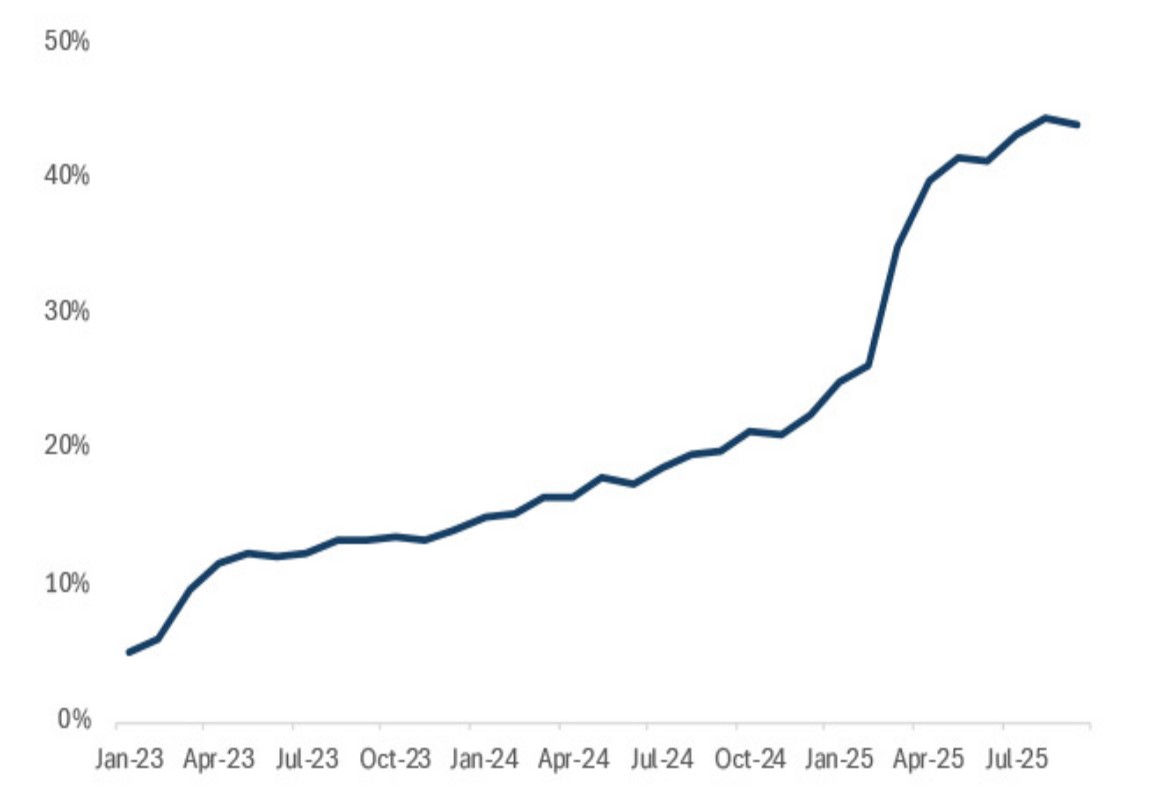 Ramp AI Index、2025年10月30日時点。Ramp AI Indexは、米国企業におけるAI製品とサービスの採用率を測定します。サンプルには、Rampの法人カードと請求書支払いプラットフォームのデータを使用して、4万以上の企業と数十億ドルの法人支出が含まれています。