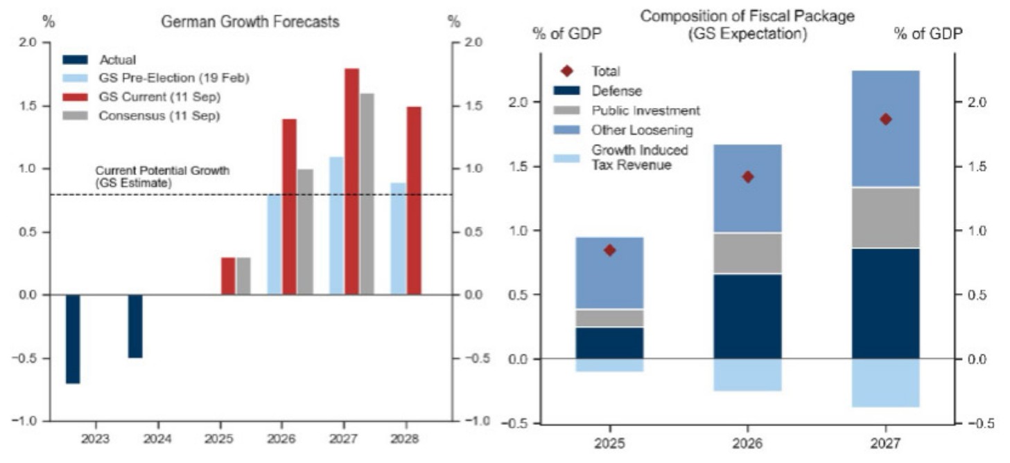 市場の見方:ゴールドマン・サックスは、ドイツのGDP成長率について、コンセンサスを約0.5%上回る明るい見通しを維持しています。