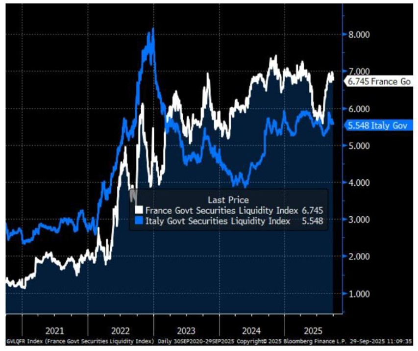 全体像:フランスの財政の道筋は特異であり、ドイツ国債に対するスプレッド(対独スプレッド)は2024年の水準に向かって拡大しています。これはここ数週間で同スプレッドが縮小してきたユーロ圏全体とは対照的です。イタリア10年国債はかつてリスクの高い資産とみなされていましたが、対独スプレッドは2008年以来の水準にまで縮小しています。