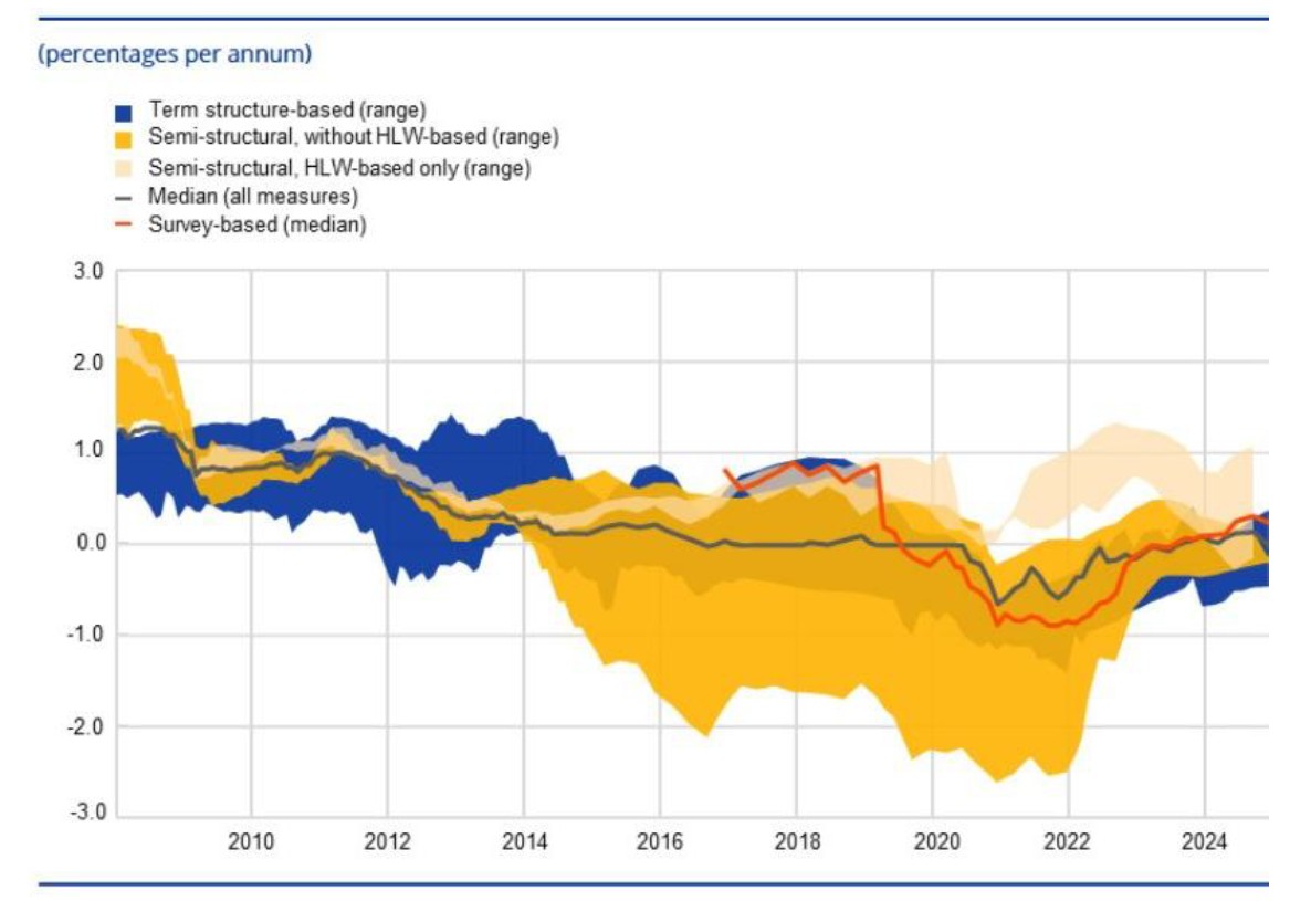 数字上は:現在の中立金利(r*)の推定値は1.75%から2.25%の範囲で、ECBのスタッフ予想における2027年のインフレ率は1.9%です。