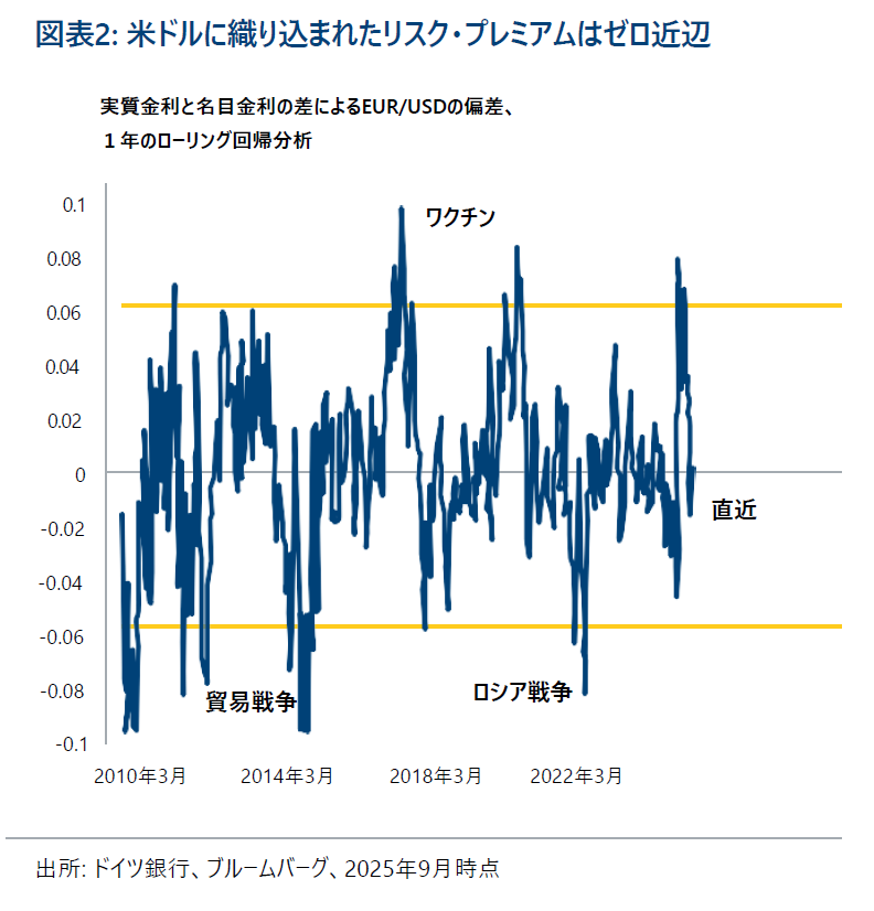 金利差が逆方向に動いたにもかかわらず、ここ数カ月間で米ドルが横ばいで推移していたため、(FRBの独立性などの)ネガティブな構造要因に対する「リスク・プレミアム」は完全に減少しました。図表2が示すように、リスク・プレミアムは5月にピークを迎えていました。上記の要因と相まって、当社では米ドルのショート・ポジションに、非対称な投資機会が存在すると考えています。