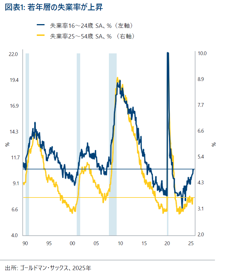 最新の米雇用関連指標を深く掘り下げ、移民の取り締まりによる労働供給の減少を念頭に置くと、弱含みの兆しが数多く見られており、これが今後の金融政策の緩和につながるはずです。発表された非農業部門雇用者数(NFP)、米労働省雇用動態調査(JOLTS)求人件数、ADP米国雇用統計はいずれも弱く、特にNFPは、2.7標準偏差の下振れというサプライズ1をもたらしましたが、これは非常に大きく、ほとんどの景気敏感セクターが雇用のマイナス成長をもたらしました。8月のチャレンジャー人員削減数は、2020年(それ以前は2008年2)以来最悪の数字となりました。そして、2021年以来初めて、求人件数当たりの失業者数の比率が1を上回っており、特に若年層の失業率の上昇が懸念されています(図表1)。