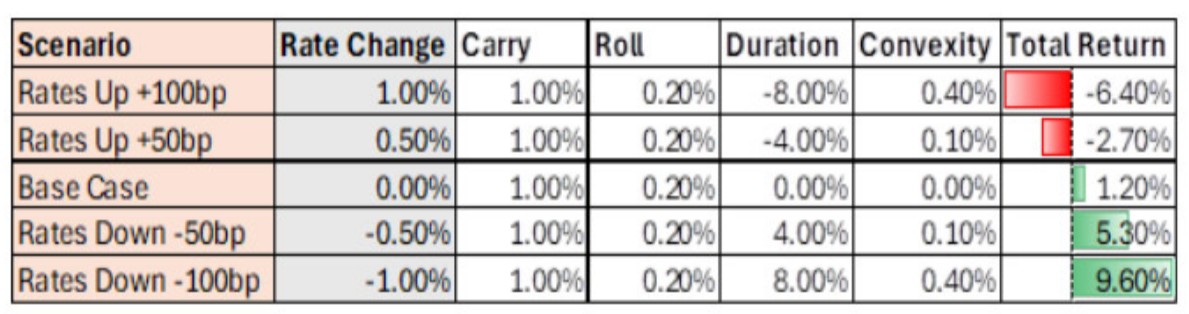 これはシンプルなシナリオで示すことができます。図表1は、金利シナリオ別の債券投資のトータルリターンですが、債券が金利上昇のマイナスを緩やかにするための耐性を持ちつつも、金利低下局面では大きなアップサイドを得られることを示しています。